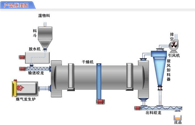 本烘干機采用順流式加熱方式。需要烘干的物料,從進料端溜進筒體,即被螺旋抄板推向后。由于烘干機傾斜放置,物料一方面在重力和回轉(zhuǎn)作用下流向后端,另一方面物料被抄板反復抄起,帶至上端再不斷地揚撒下來,使物料在筒內(nèi)形成均勻的幕簾,充分與筒內(nèi)的熱氣流進行熱交換,由于物料反復揚撒,所含的水分逐漸被烘干,從而達到烘干的目的。該物料適合于700度以下的烘干溫度。